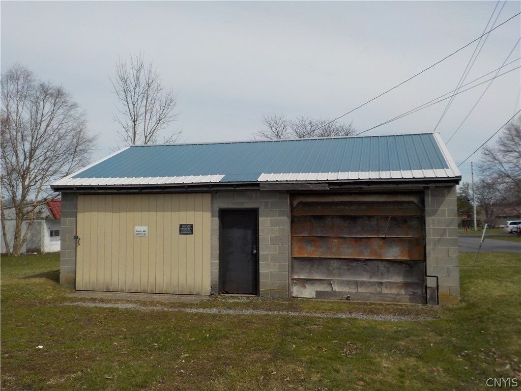 1.24 Acres next to Jordan Elbridge Middle School. (3) 2 Bedrm apts. Each with kitchen, living room, dining area, Bathroom with laundry area, Front enclosed porches. There is a garage/shop with hydraulic car/truck lift & office. Full basement, + 4 bays for storage. 24 x 32 cement block detached garage, lots of parking.